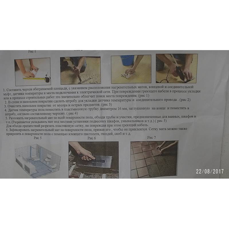 Нагревательный мат устанавливается под плитку, в плиточный клей. Разогрев происходит засчёт преобразования электрической энергии в тепловую. Кабель имеет сверхнадёжную конструкцию и высокий запас прочности. Сверху кабель имеет PVC оболочку, температура плавления которой 105*С. Под ней находится сплошной алюминиевый экран который покрывает две греющие жилы, заземляющую жилу и стекловолоконную жилу.